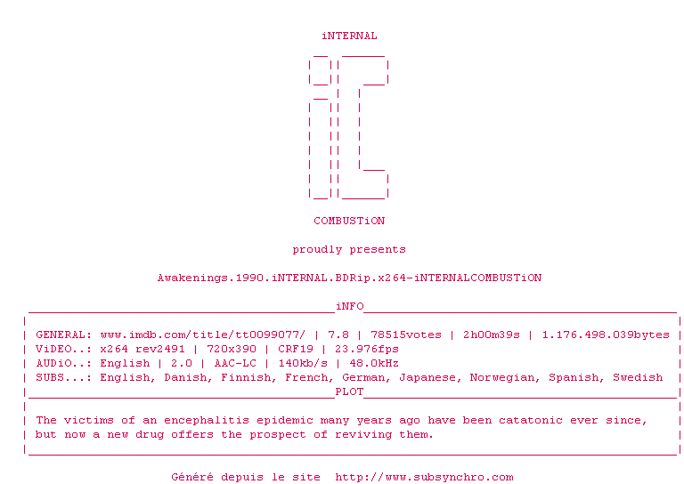 Voir le nfo de la release Awakenings.1990.iNTERNAL.BDRip.x264-iNTERNALCOMBUSTiON