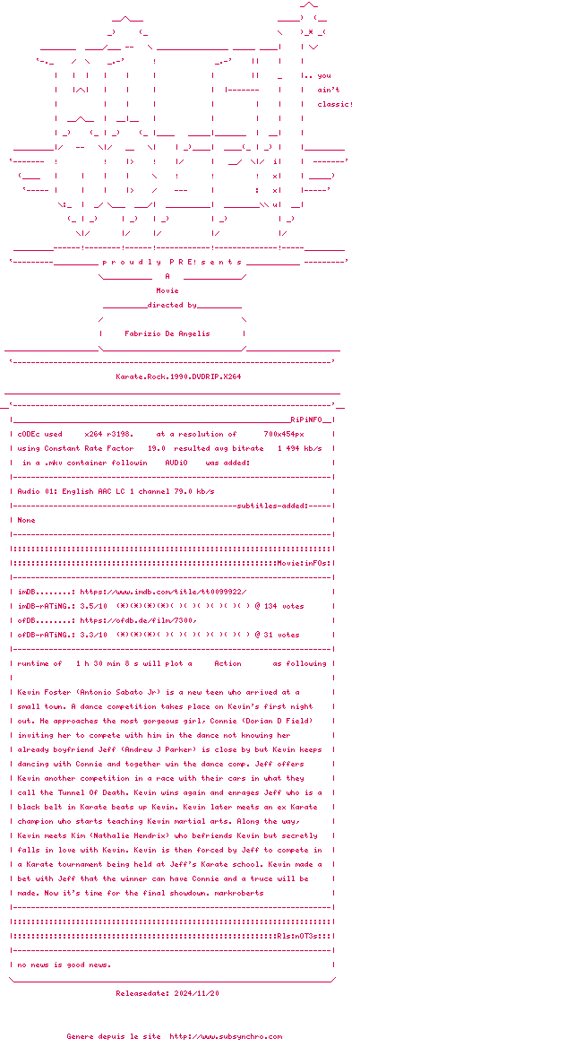 Voir le nfo de la release Karate.Rock.1990.DVDRIP.x264-WATCHABLE