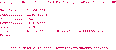 Y avez-vous pense ? Nous proposons déjà 1939 sous-titres pour le film La créature du cimetière. Avez-vous essaye de voir si ces sous-titres etaient compatibles avec cette release ? On vous laisse le soin de tester cela pour nous et de contribuer au site en postant le sous-titre en cas de compatiblite constatee !