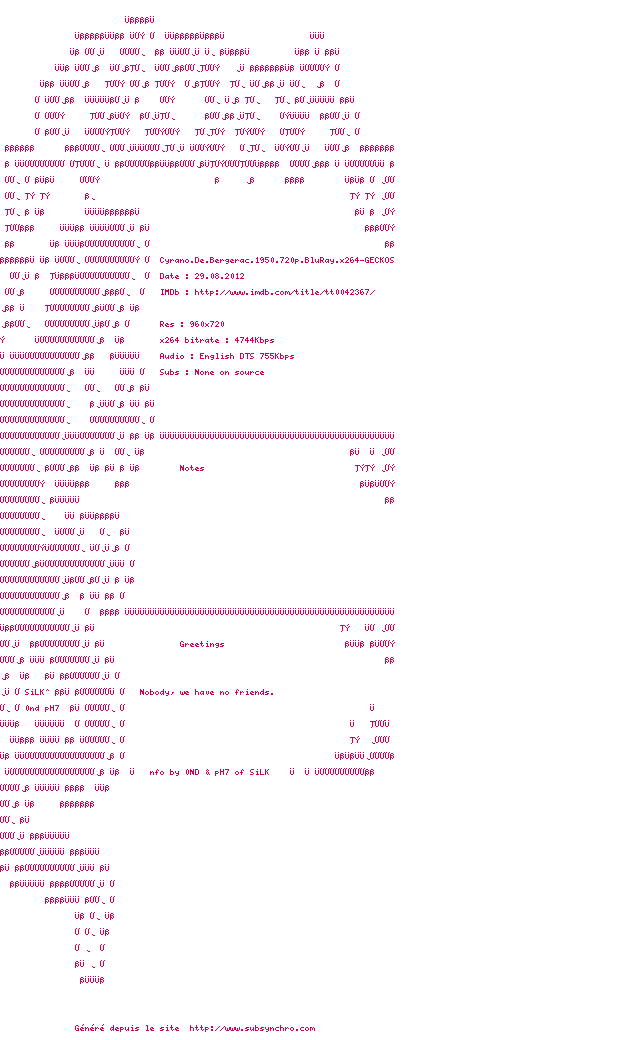 | Voir le nfo de la release Cyrano.De.Bergerac.1950.720p.BluRay.x264-GECKOS | GECKOS | Cyrano.De.Bergerac.1950.720p.BluRay.x264-GECKOS OpenSubtitles | 0 fichier | ||