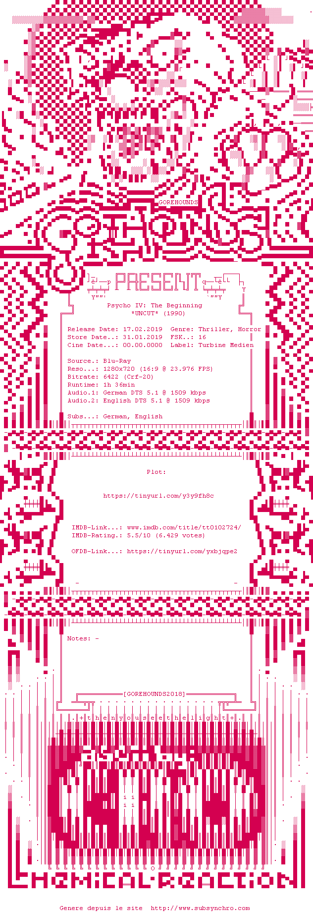 Voir le nfo de la release Psycho.IV.The.Beginning.1990.DL.720p.BluRay.x264-GOREHOUNDS