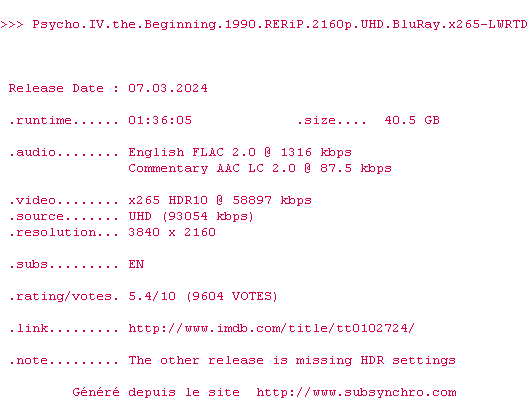 Voir le nfo de la release Psycho.IV.The.Beginning.1990.RERiP.2160p.UHD.BluRay.x265-LWRTD