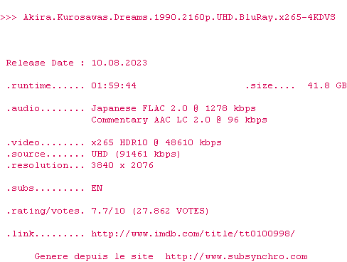 La release Akira.Kurosawas.Dreams.1990.2160p.UHD.BluRay.x265-4KDVS est en 4K