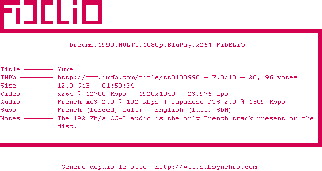 Y avez-vous pense ? Nous proposons déjà 1516 sous-titres pour le film Rêves / Dreams. Avez-vous essaye de voir si ces sous-titres etaient compatibles avec cette release ? On vous laisse le soin de tester cela pour nous et de contribuer au site en postant le sous-titre en cas de compatiblite constatee !
