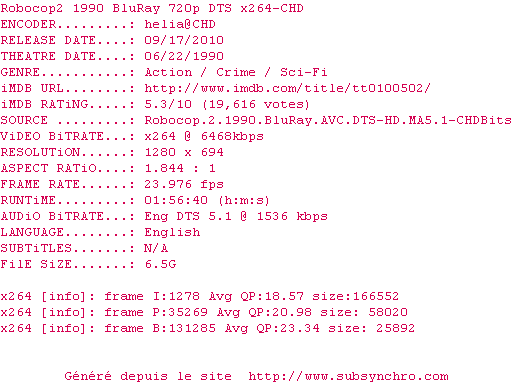 Voir le nfo de la release Robocop.2.1990.BluRay.720p.DTS.x264-CHD