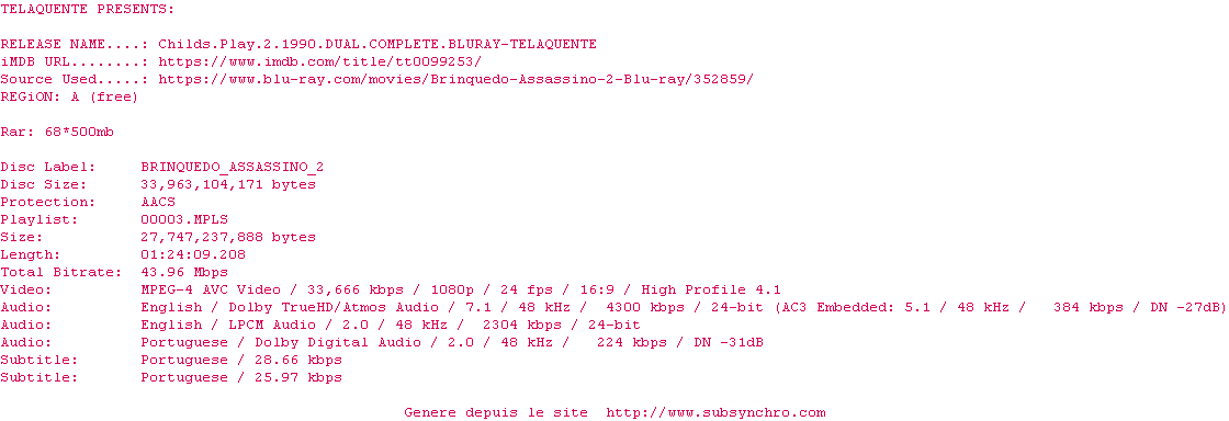 Voir le nfo de la release Childs.Play.2.1990.DUAL.COMPLETE.BLURAY-TELAQUENTE