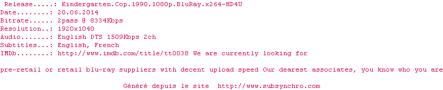 Voir le nfo de la release Kindergarten.Cop.1990.1080p.BluRay.x264-HD4U