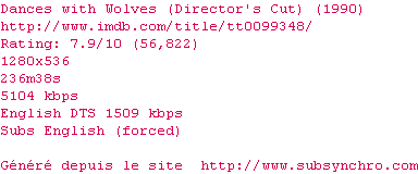 Dances.with.Wolves.DC.1990.720p.x264-BestHD.srt Ajouté par Kabyll Ajoute le 18-09-2011 20:22:09 Format : SRT Italique : Non Taille : 0.00Ko Telechargement : 651 Ajouter cette release à ma collection en cas de telechargement des sous-titres 0 0 0 Telecharger le ZiP contenant NFO, Affiche, Sous-titre (*.srt) Commentez le fichier Dances.with.Wolves.DC.1990.720p.x264-BestHD.srt Commentez le fichier Dances.with.Wolves.DC.1990.720p.x264-BestHD.srt Commentez ce fichier Le fichier 4814-1316370129.srt n'existe pas ! Telechargez le RSS « Fichier de la release Dances.With.Wolves.DC.1990.720p.BluRay.x264-BestHD » Retour au film « Danse avec les loups »