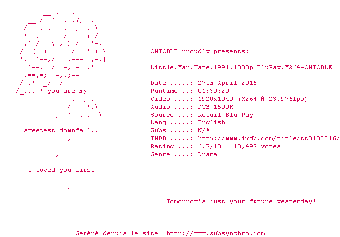 Voir le nfo de la release Little.Man.Tate.1991.1080p.BluRay.X264-AMIABLE