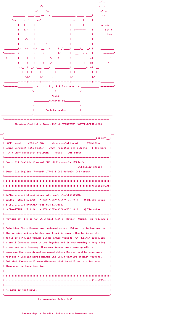 Voir le nfo de la release Showdown.In.Little.Tokyo.1991.ALTERNATIVE.MASTER.720P.BLURAY.x264-WATCHABLE