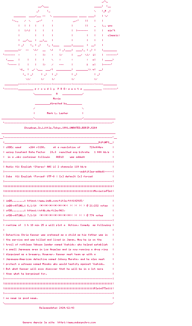 Voir le nfo de la release Showdown.In.Little.Tokyo.1991.ALTERNATIVE.MASTER.UNRATED.720P.BLURAY.x264-WATCHABLE