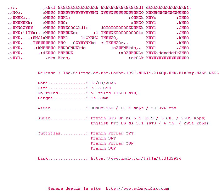 Y avez-vous pense ? Nous proposons déjà 1 sous-titre pour le film Le Silence des agneaux. Avez-vous essaye de voir si ces sous-titres etaient compatibles avec cette release ? On vous laisse le soin de tester cela pour nous et de contribuer au site en postant le sous-titre en cas de compatiblite constatee !