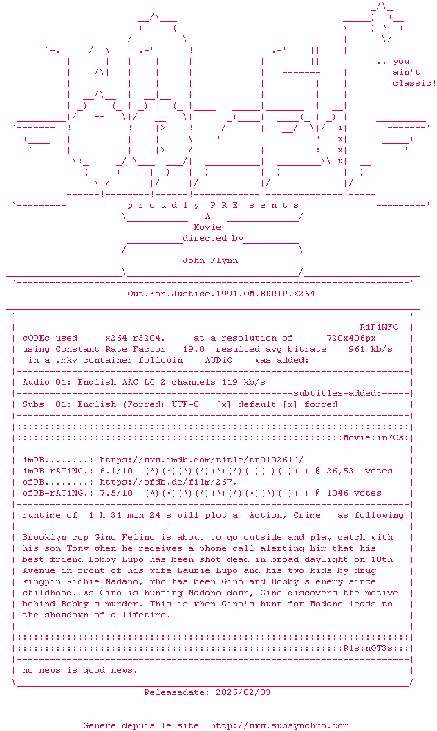 Voir le nfo de la release Out.For.Justice.1991.OM.BDRIP.x264-WATCHABLE
