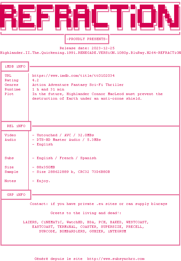Highlander : Le Retour (Highlander II: The Quickening) , realise en 1991