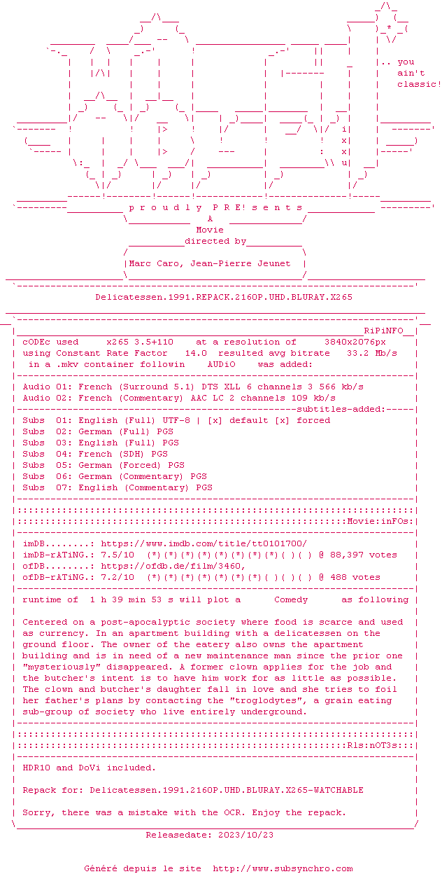 Voir le nfo de la release Delicatessen.1991.REPACK.2160P.UHD.BLURAY.x265-WATCHABLE