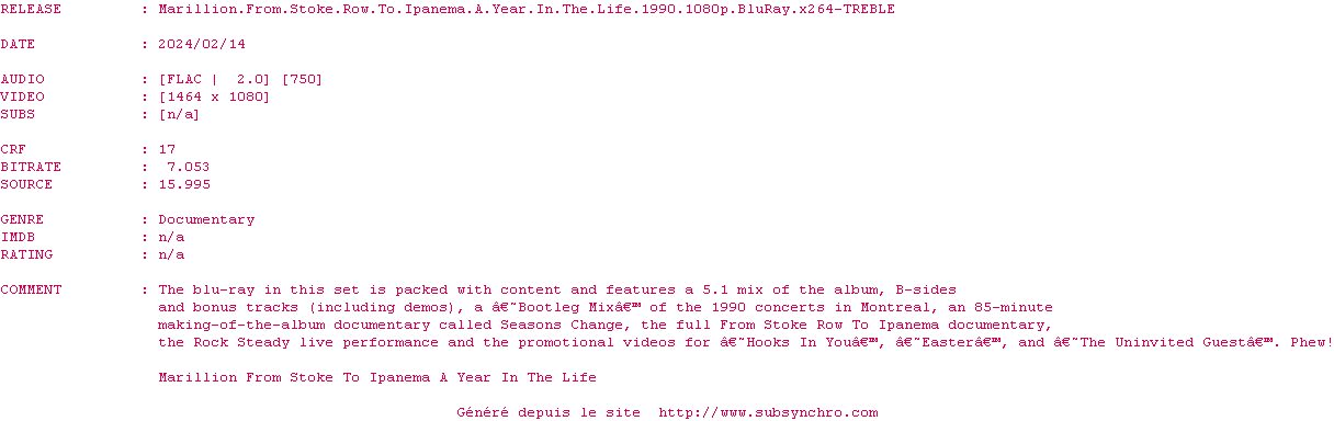Voir le nfo de la release Marillion.From.Stoke.Row.To.Ipanema.A.Year.In.The.Life.1990.1080p.BluRay.x264-TREBLE