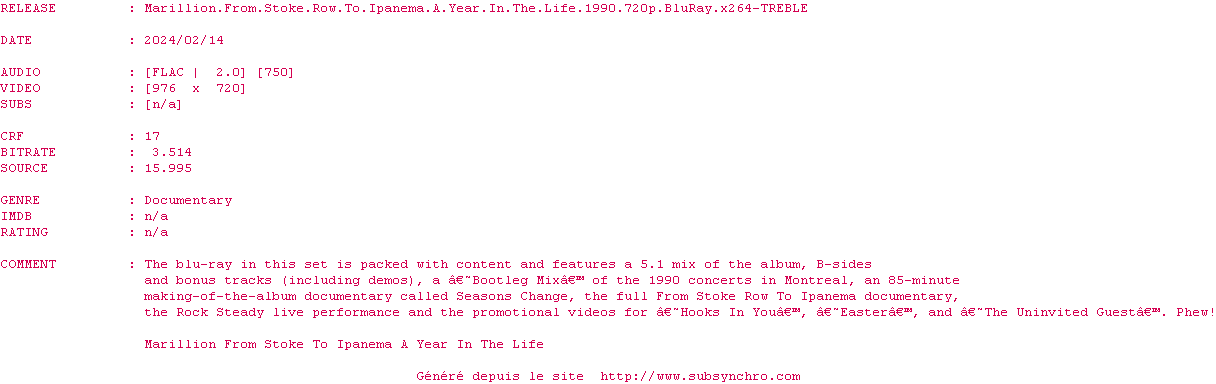 Voir le nfo de la release Marillion.From.Stoke.Row.To.Ipanema.A.Year.In.The.Life.1990.720p.BluRay.x264-TREBL