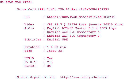 Y avez-vous pense ? Nous proposons déjà 1882 sous-titres pour le film Stone Cold. Avez-vous essaye de voir si ces sous-titres etaient compatibles avec cette release ? On vous laisse le soin de tester cela pour nous et de contribuer au site en postant le sous-titre en cas de compatiblite constatee !