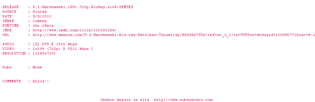 Voir le nfo de la release V.I.Warshawski.1991.720p.BluRay.x264-SEMTEX