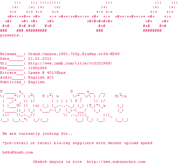 | Voir le nfo de la release Grand.Canyon.1991.1080p.BluRay.x264-HD4U | HD4U | Grand.Canyon.1991.1080p.BluRay.x264-HD4U OpenSubtitles | 0 fichier | ||