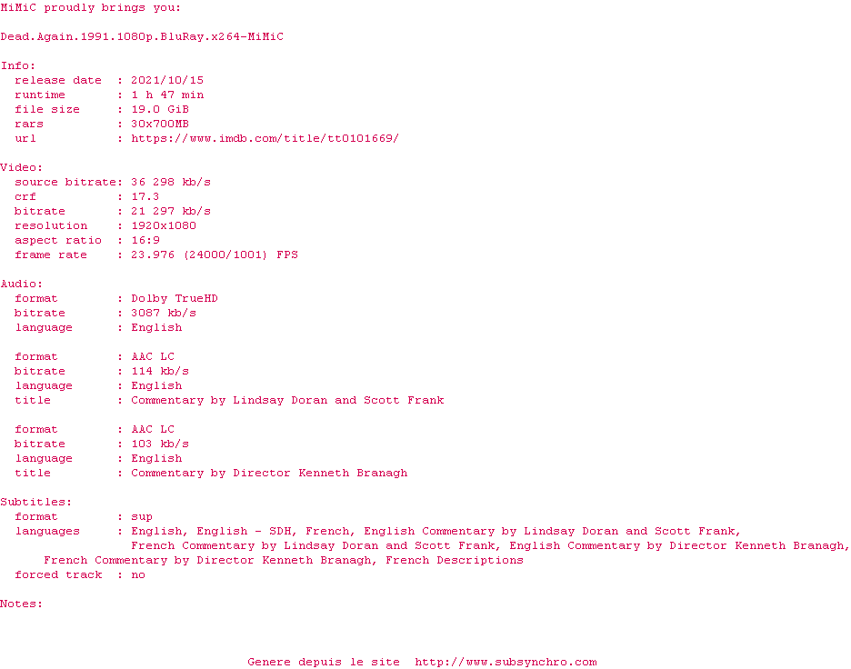 Y avez-vous pense ? Nous proposons déjà 1277 sous-titres pour le film Dead Again. Avez-vous essaye de voir si ces sous-titres etaient compatibles avec cette release ? On vous laisse le soin de tester cela pour nous et de contribuer au site en postant le sous-titre en cas de compatiblite constatee !