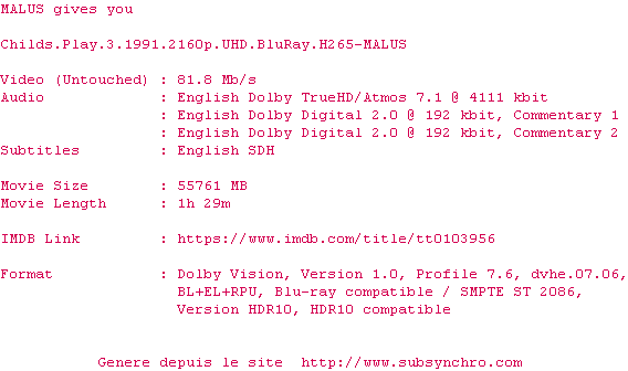 Voir le nfo de la release Childs.Play.3.1991.2160p.UHD.BluRay.H265-MALUS