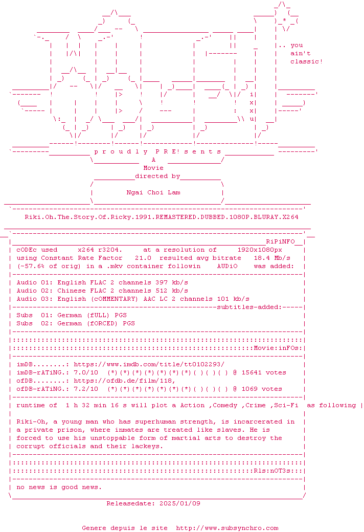 Riki-Oh Saiga, un jeune homme ayant des capacités surhumaines en arts martiaux est enfermé dans une prison tenue par des officiers corrompus.