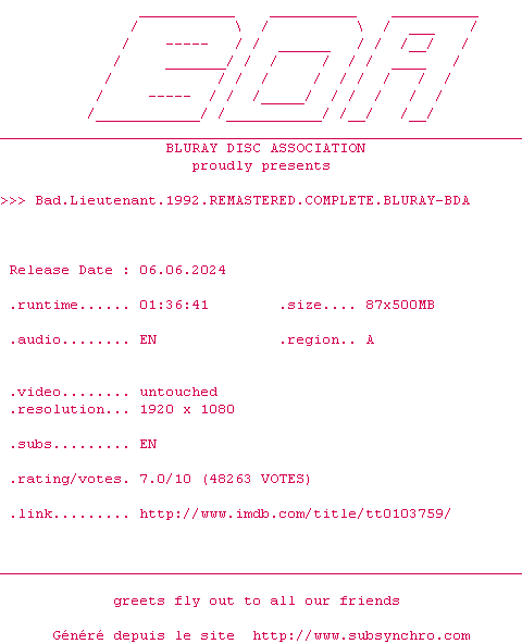 Voir le nfo de la release Bad.Lieutenant.1992.REMASTERED.COMPLETE.BLURAY-BDA