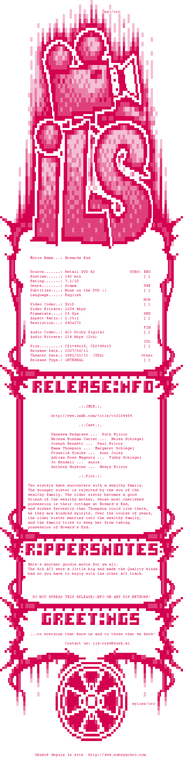 Voir le nfo de la release Howards.End.1992.iNTERNAL.DVDRip.XviD-iLS