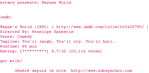 Voir le nfo de la release Waynes.World.1992.iNT.DVDRip.XviD-eXtaCY