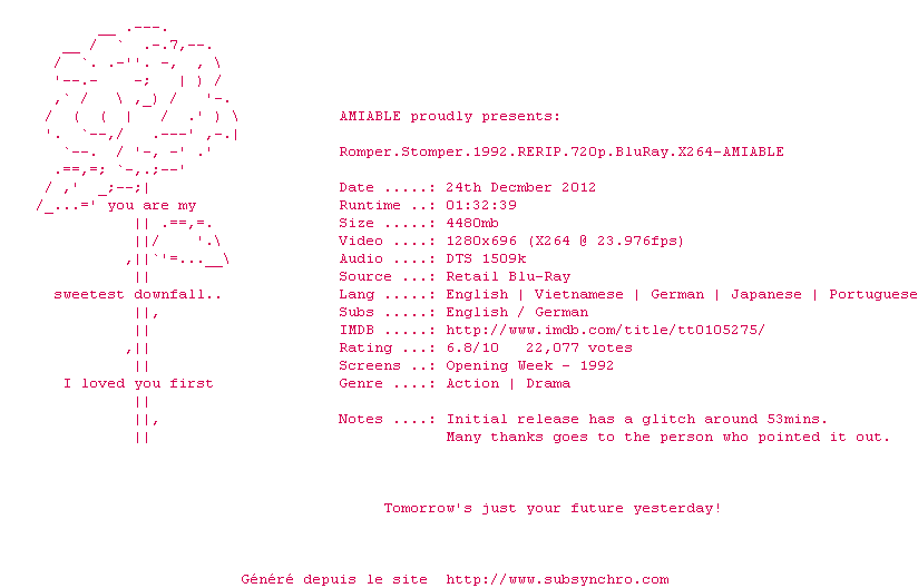 Voir le nfo de la release Romper.Stomper.1992.RERIP.720p.BluRay.x264-AMIABLE