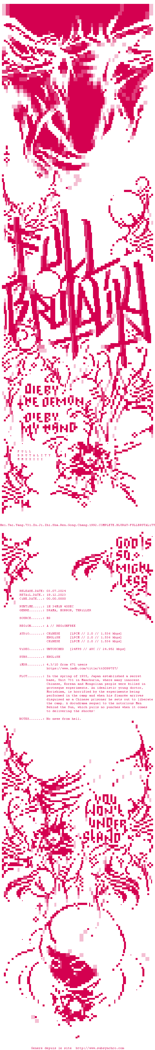Voir le nfo de la release Hei.Tai.Yang.731.Xu.Ji.Zhi.Sha.Ren.Gong.Chang.1992.COMPLETE.BLURAY-FULLBRUTALiTY