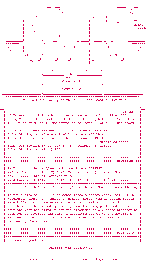 Voir le nfo de la release Maruta.2.Laboratory.Of.The.Devil.1992.1080P.BLURAY.x264-WATCHABLE