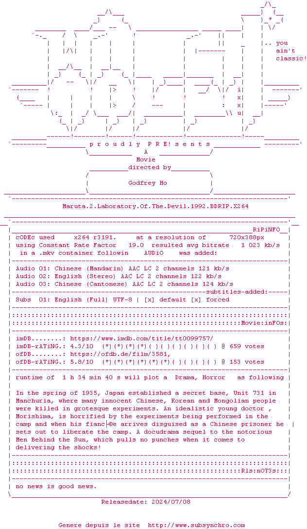 Voir le nfo de la release Maruta.2.Laboratory.Of.The.Devil.1992.BDRIP.x264-WATCHABLE