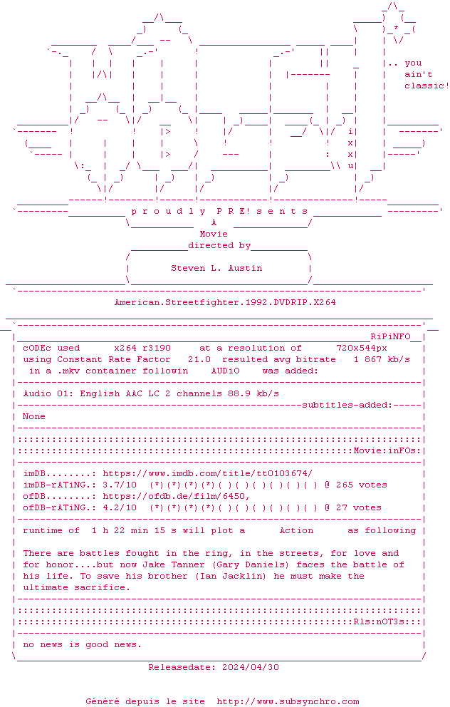 Voir le nfo de la release American.Streetfighter.1992.DVDRIP.x264-WATCHABLE