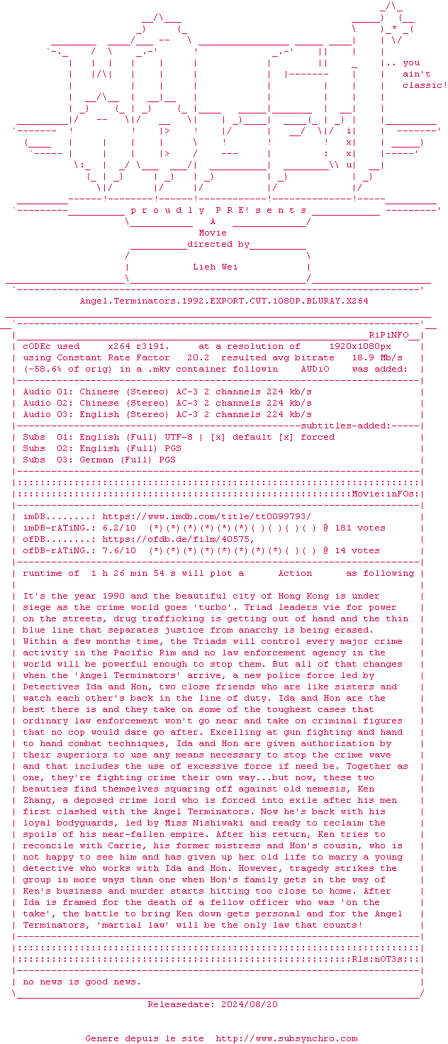 Voir le nfo de la release Angel.Terminators.1992.EXPORT.CUT.1080P.BLURAY.x264-WATCHABLE