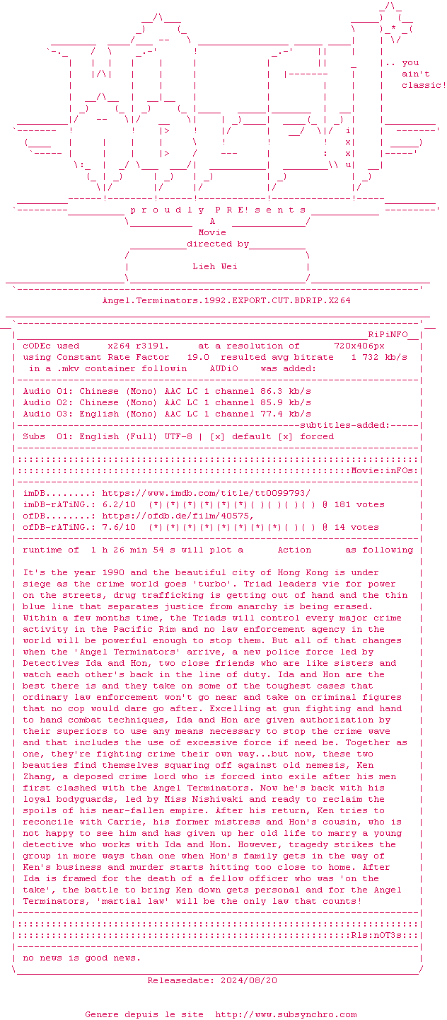 Voir le nfo de la release Angel.Terminators.1992.EXPORT.CUT.BDRIP.x264-WATCHABLE