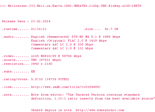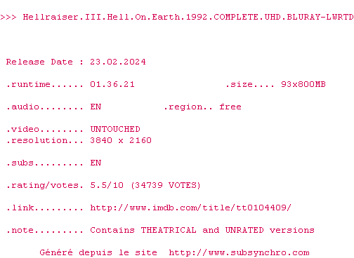En tout cas, celui là n'est pas vraiment recommandable. Si vous voulez plus de Hellraiser après les 2 premiers films, vous pouvez faire vraiment pire que ce film, mais le non respect de certains personnages pourra vous rebuter.