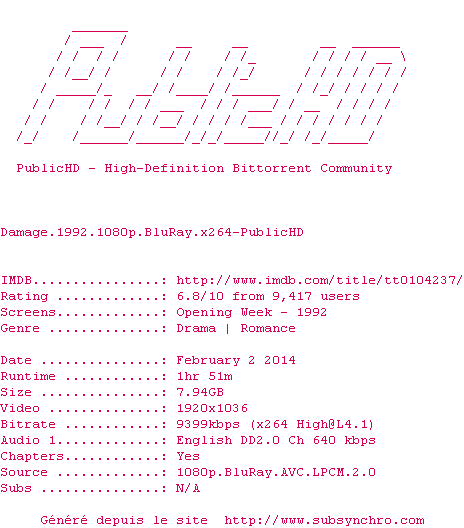 Voir le nfo de la release Damage.1992.1080p.BluRay.x264-PublicHD
