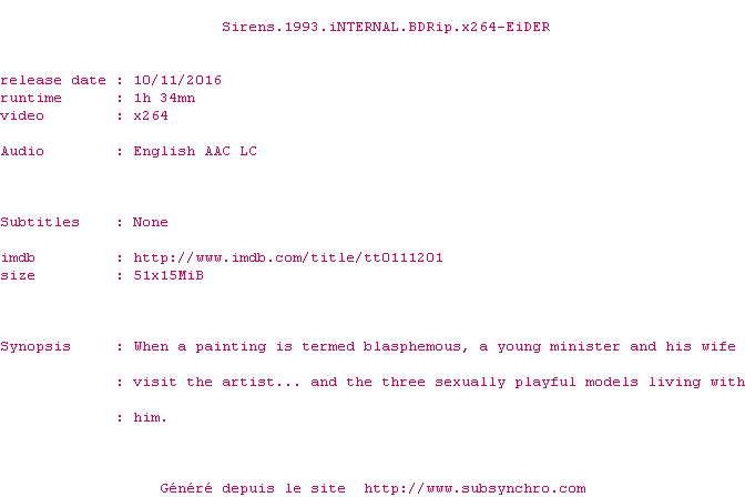 Voir le nfo de la release Sirens.1993.1080p.BluRay.x264-EiDER
