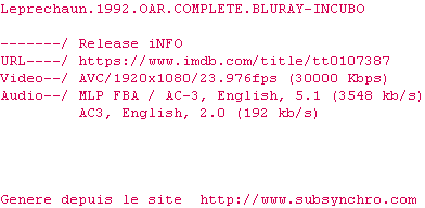 Y avez-vous pense ? Nous proposons déjà 1198 sous-titres pour le film Leprechaun. Avez-vous essaye de voir si ces sous-titres etaient compatibles avec cette release ? On vous laisse le soin de tester cela pour nous et de contribuer au site en postant le sous-titre en cas de compatiblite constatee !