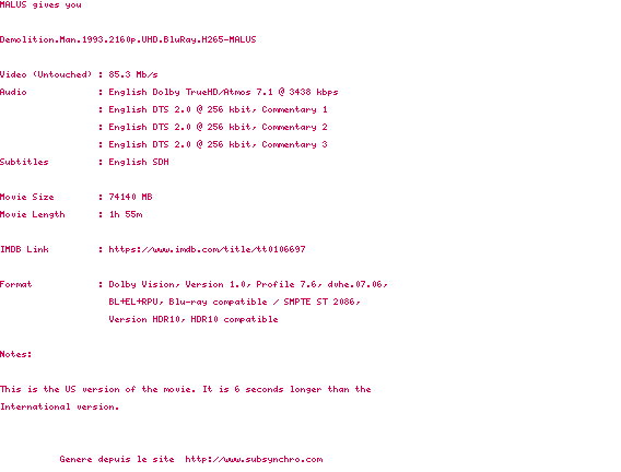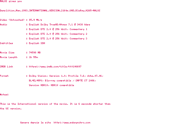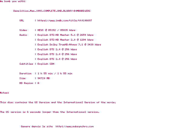 Voir le nfo de la release Demolition.Man.1993.INTERNATIONAL.VERSION.2160p.UHD.BluRay.H265-MALUS