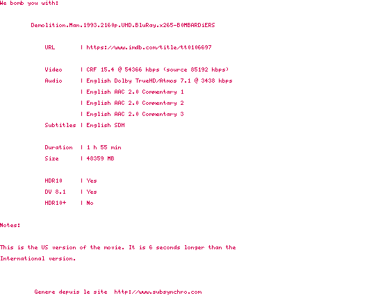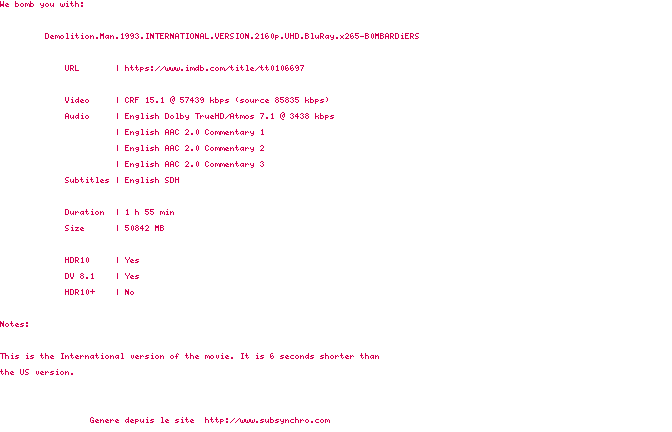 Voir le nfo de la release Demolition.Man.1993.2160p.UHD.BluRay.x265-B0MBARDiERS