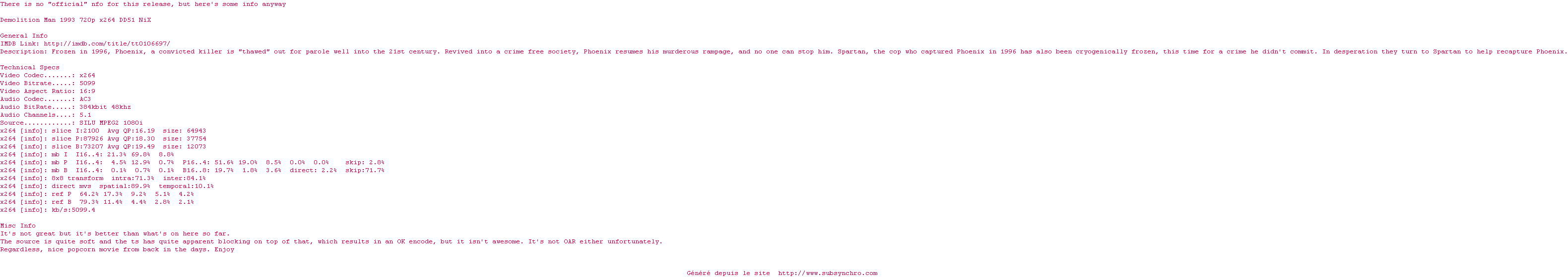 Voir le nfo de la release Demolition.Man.1993.720p.HDTV.DD51.x264-NiX