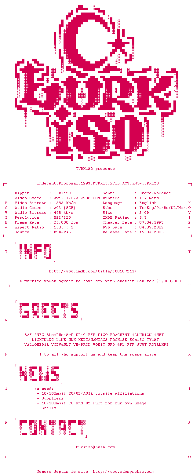 Voir le nfo de la release Indecent.Proposal.1993.DVDRip.XViD.AC3.iNT-TURKiSO
