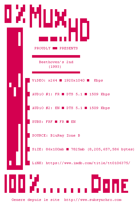Voir le nfo de la release Beethovens.2nd.1993.MULTi.1080p.BluRay.x264-MUxHD