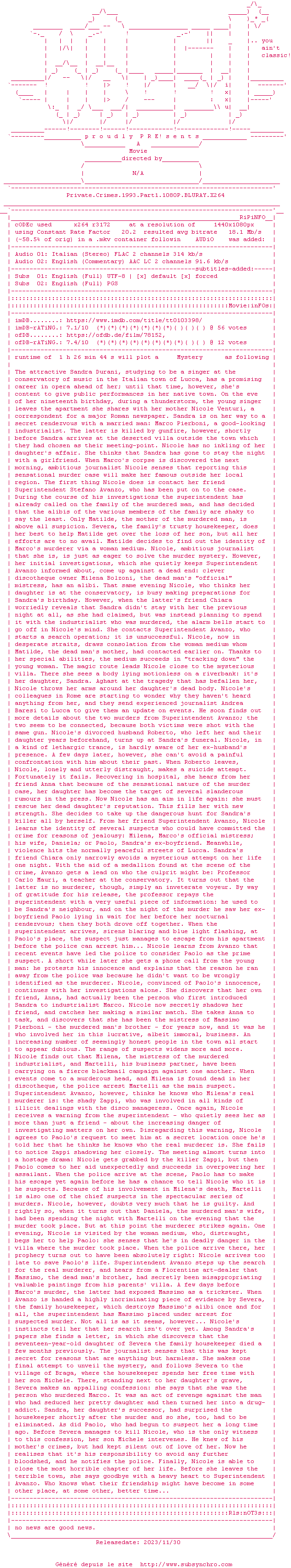 Voir le nfo de la release Private.Crimes.1993.Part1.1080P.BLURAY.x264-WATCHABLE