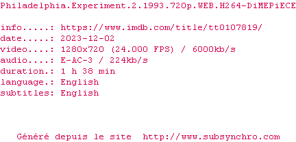 | Voir le nfo de la release Philadelphia.Experiment.2.1993.720p.WEB.H264-DiMEPiECE | DiMEPiECE | Philadelphia.Experiment.2.1993.720p.WEB.H264-DiMEPiECE OpenSubtitles | 0 fichier |