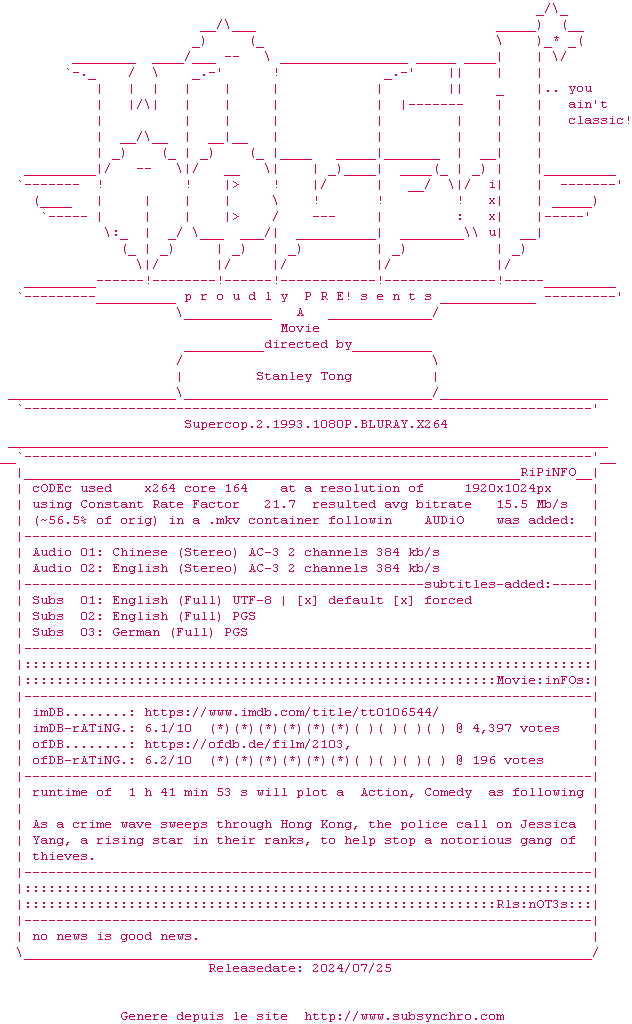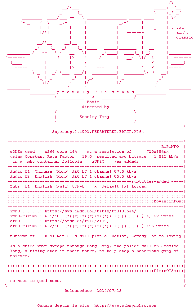 Voir le nfo de la release Supercop.2.1993.REMASTERED.BDRIP.x264-WATCHABLE