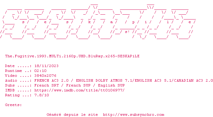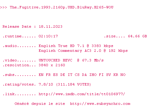 Le commentaire de Yaumegui Commente par Yaumegui (554), Le Lundi 20 Janvier 2014 à 23h16 Bon thriller qui sans être original tient sa promesse de détendre le spectateur. Il alterne scènes dramatiques et scénettes humoristiques avec l'équipe de flics. Harrison Ford et Tommy Lee Jones font très honnêtement le boulot. 7.5 / 10 1 0